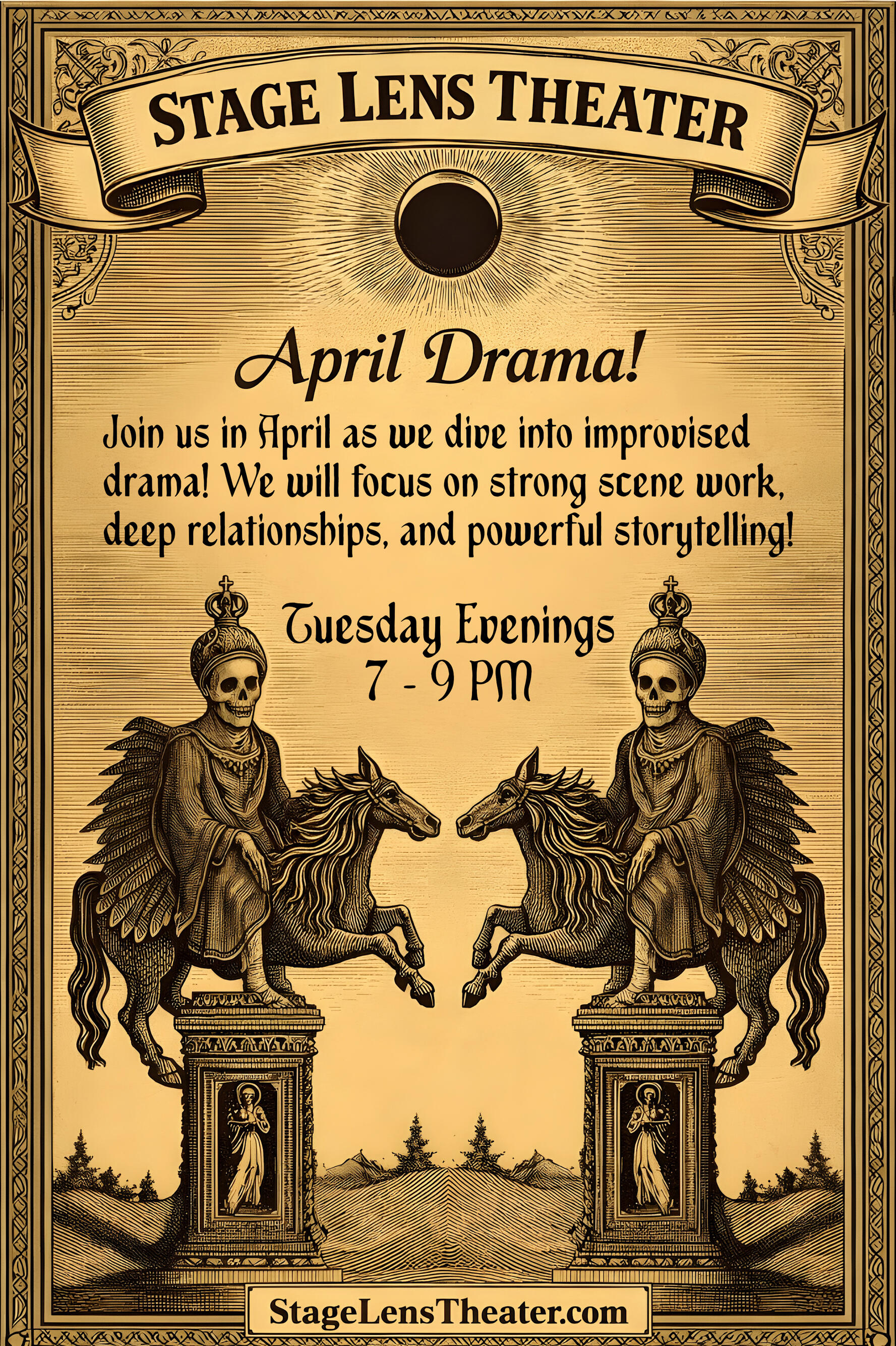 Join us in April as we dive into improvised Drama! This class will focus on deep relationships, strong emotional stakes, exploring the concept of drama and how to be dramatic while still maintaining grounded relationships and strong scene work.Location : The Finnish Hall - 1970 Chestnut St. Berkeley, CA 94702Dates: April 7th, 14th, 21st, 28th Tuesday evenings from 7 - 9 PM.Price: $110